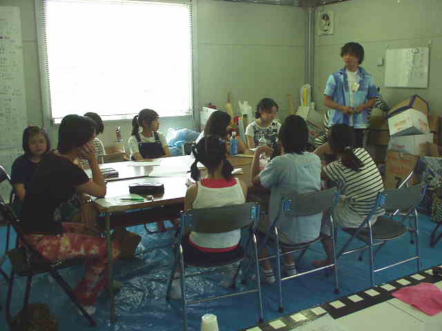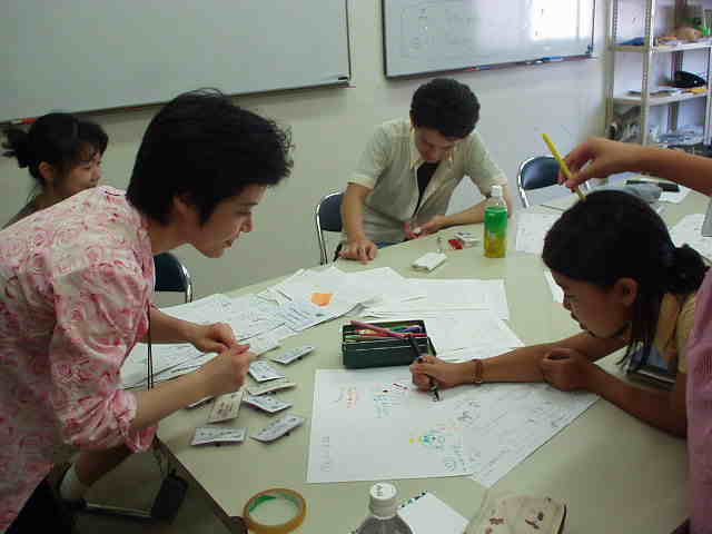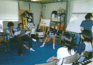 | 今日は脚本づくり2日目。前回出席率がよかったのに、今日はとても少なくてちょっと淋しかった。それでも、少ないながらも、クーラーのない蒸し暑い部屋であれこれ案を出してがんばってました。「あ〜、こうやって"自分たちの映画"が作られていくんだな〜」としみじみ。私もスタッフという立場そっちのけで参加したくなっちゃった。いいな、いいな〜!!! 中学生でこんな体験ができるなんて、す〜っごくうらやましい!!!!! |